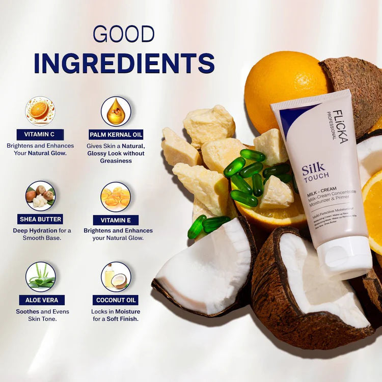 Achieve a professional, camera-ready finish with the Flicka Silk Touch 3-in-1 Primer & Moisturizer. This multi-tasking miracle cream combines the benefits of a moisturizer, primer, and skin protector in one lightweight formula. Designed to create a smooth, pore-blurring canvas, it ensures your makeup stays flawless and dewy all day long.